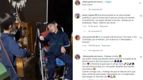 Santa Fé.- En esta provincia dos amiguitos, Santiago y Felipe, explotaron las redes sociales de amor y de ternura con un video haciendo música, pero en donde también demuestran el compañerismo y el verdadero sentimiento de amistad.Se hicieron conocidos, en el día previo al día del amigo en todo el país como los mejores amigos santafesinos, sueñan con recorrer el país llevando su música. Pero lo que nunca se imaginaron las familias, es que los videos los verían artistas como "La Sole" o Abel Pintos, ni mucho menos, que participarían de un programa en televisión.Las imagenes fueron publicadas por los padres de Felipe. En ellas, se los ve a el y a su amigo interpretando Luna Cautiva, de Los Chalchaleros. La mamá de Felipe explicó que compartió el momento luego de emocionarse con la actitud de los pequeños de 8 años: "Nosotros no venimos de una familia con tradición folklórica. Nada de eso. Incluso Feli comenzó a tocar la guitarra hace dos años, luego de que su abuela Ramona le regalara una que trajo de viaje". Felipe tiene clases dos veces por semana y también va a canto con el coach de Abel Pintos.Video:https://youtu.be/KfwNE5UiU7EVideos: Instagram @ _felipe.gutierrez.merce_"Nuestra relación con la música se vio potenciada a partir de esto. Ni siquiera poníamos música en casa, pero a partir de esto, con mi marido buscamos canciones para que Feli pueda conocer y luego cantar" explicó.Esta amistad a través de la música se transformó en una rutina de todos los martes que unió a estos dos amigos Santiago y Felipe. Ambos comparten una rutina que se repite cada martes luego de la escuela, cuando Santiago, a quien le gusta ir a ver a Felipe tocar y cantar en otros lugares, sale de su terapia y se dirige hacia la casa de su amiguito para cantar canciones y tocar el bombo."Viene a casa y pide la guitarra de Feli. Es un clásico de todos los martes que empezó como un juego. Fue por eso que yo subía los videos. Un día Feli le prestó el bombo y le enseñó a Santi cómo tocarlo", recordó Ivana.La mama de Santiago, indicó que su hijo padece una discapacidad desde nacimiento, la cual le impide caminar y le produjo una parálisis cerebral con retraso madurativo que le ocasionó una hemiplegia del lado derecho de su cuerpo."No podemos creer que un video haya generado tanto. Ellos lo hacen todos los martes sin excepción. Cuando Santi sale de una de sus terapias va directamente lo de Feli, con quien tiene una relación que no es frecuente en nenes chiquitos". También sostuvo que a su familia la apasiona el folclore, al punto de que suelen bailarlo en fiestas y peñas a las que acuden con frecuencia. "Nos juntamos con amigos o entre nosotros y guitarreamos. Solemos ir a festivales, como Cosquín o Jesús María. A Feli le encanta también. Incluso le gusta más bailar que cantar", expresó."No podemos mentirle en nada porque entiende todo. Le encanta el tenis y el fútbol, aunque no poder jugar lo pone triste. Pero con el andador logra estar al aire libre y jugar", agregó la mujer. "La relación que tiene con Santi es muy especial. Él ama tocar el bombo y pasar el tiempo junto a él. El grupo de la escuela es increíble, todos los compañeros lo esperan e incluyen. Es un nene muy feliz".Este domingo, los 'mejores amigos santafesinos' se presentarán en el programa de Telefé "La Peña de Morfi". Allí, llevarán su mensaje e interpretarán varios temas de los que practican cuando se reúnen.