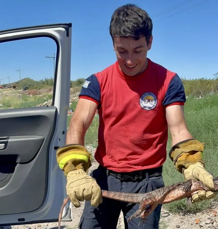 Cuando llegaron, el lagarto colorado estaba escondido entre leñas en el sector de J.F Kennedy y Roca. Según informaron desde el cuartel, después de agarrarlo lo trasladaron a su hábitat natural en la zona de las bardas.