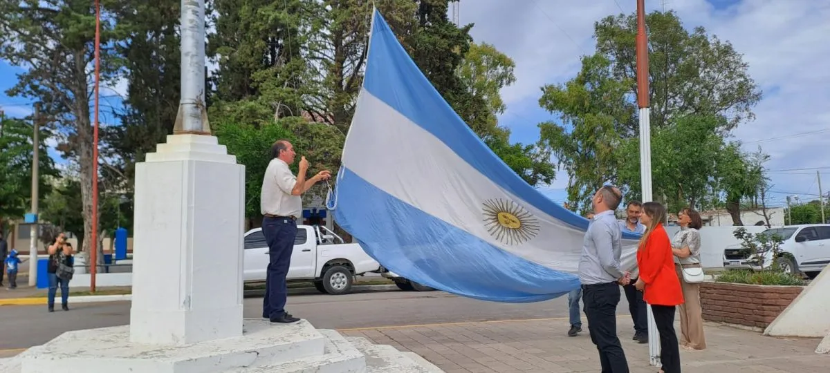 El intendente local Robin del Río junto a autoridades municipales y provinciales realizaron el izamiento de bandera para luego realizar la entrega de aportes a instituciones y escrituras a vecinos.