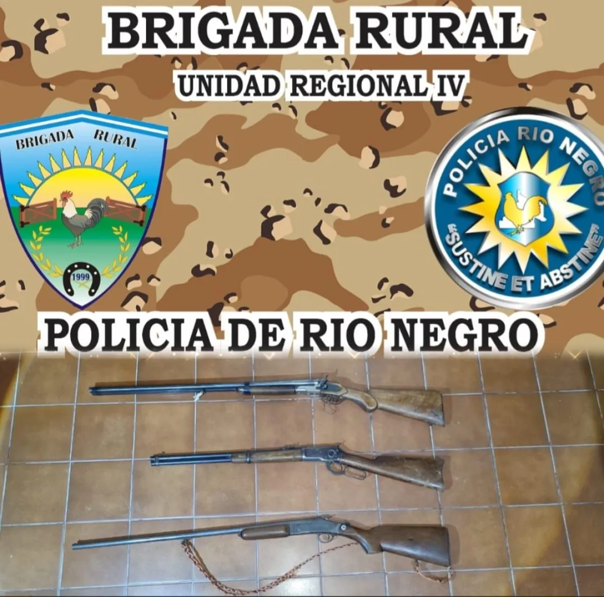 En un operativo de control preventivo realizado durante la madrugada del lunes, personal de la Brigada Rural de la Unidad Regional IV de la Policía de Río Negro secuestró tres armas de fuego que eran transportadas sin la documentación correspondiente en un vehículo que circulaba por la zona rural entre Coronel Belisle y Chimpay.