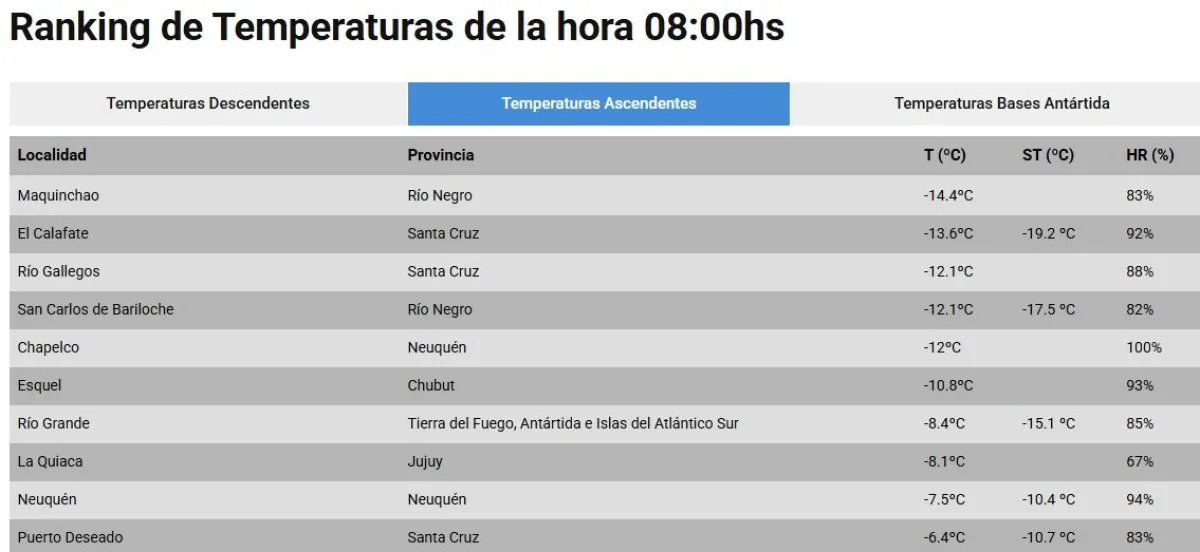 Otras ciudades que aparecen en el top diez son Neuquén capital con 7 grados bajo cero y Puerto Deseado con 6 grados bajo cero.