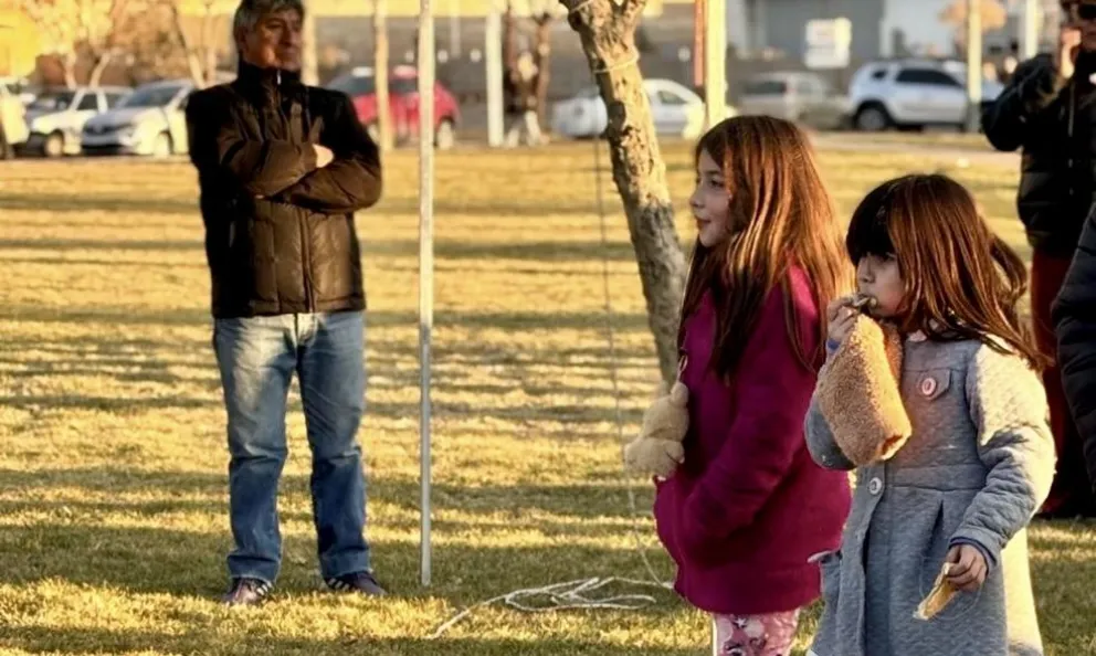 Cerca de las las 17.30, la renovada plaza Las Bardas estaba tapizada de chicos, chicas que recibían los últimos rayos de sol de barniz sobre sus rostros felices. Mientras algunas personas repartían tortas fritas y chocolate caliente, milies y miles de burbujas entretenían a niños que intentaban agarrarlas sin éxito.
