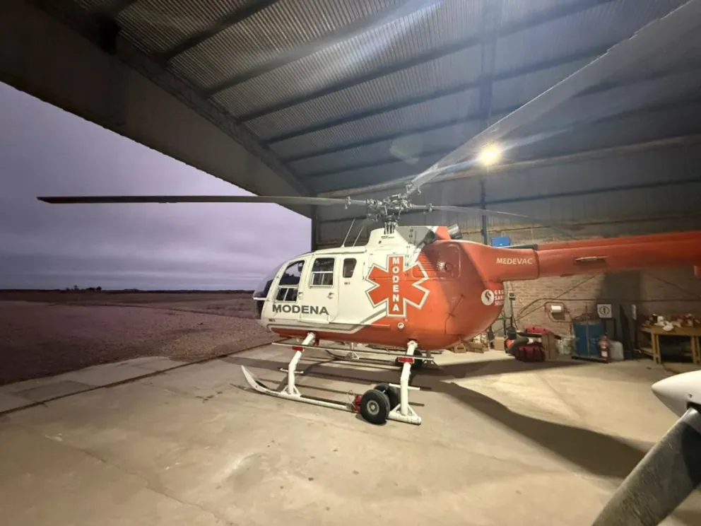 El helicóptero sanitario, perteneciente a la empresa Modena Air Service, fue contratado para brindar cobertura a la traza del oleoducto que conectará la zona productiva de Vaca Muerta con Punta Colorada, Sierra Grande.