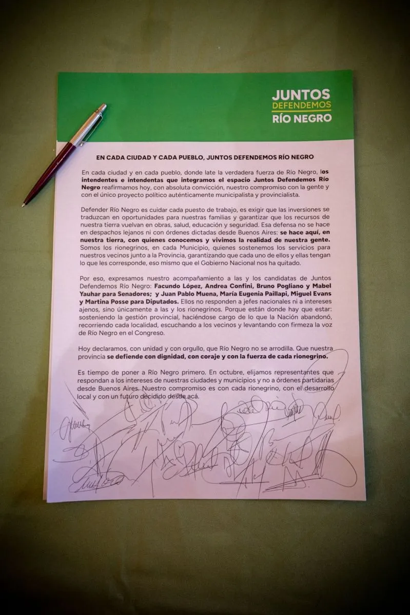 Veintiocho intendentes e intendentas de la provincia ratificaron hoy su compromiso con el espacio Juntos Defendemos Río Negro y expresaron su apoyo a los candidatos que competirán en las elecciones del 26 de octubre.