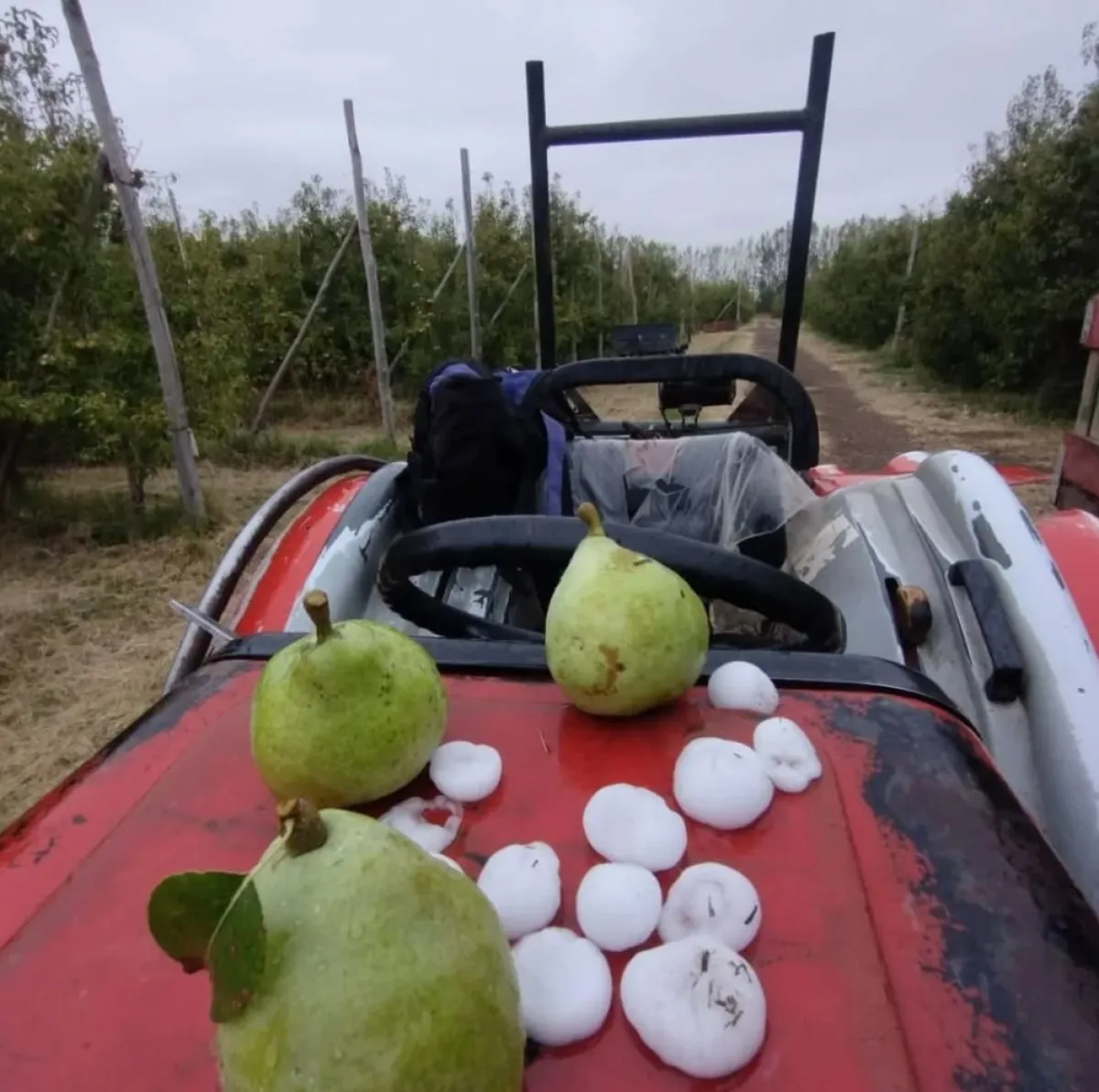 A través de fotografías y videos enviados por vecinos, se pudo observar la caída de frutas en las chacras ubicadas dentro de la jurisdicción de la localidad, lo que da cuenta del impacto del granizo sobre la producción frutícola.