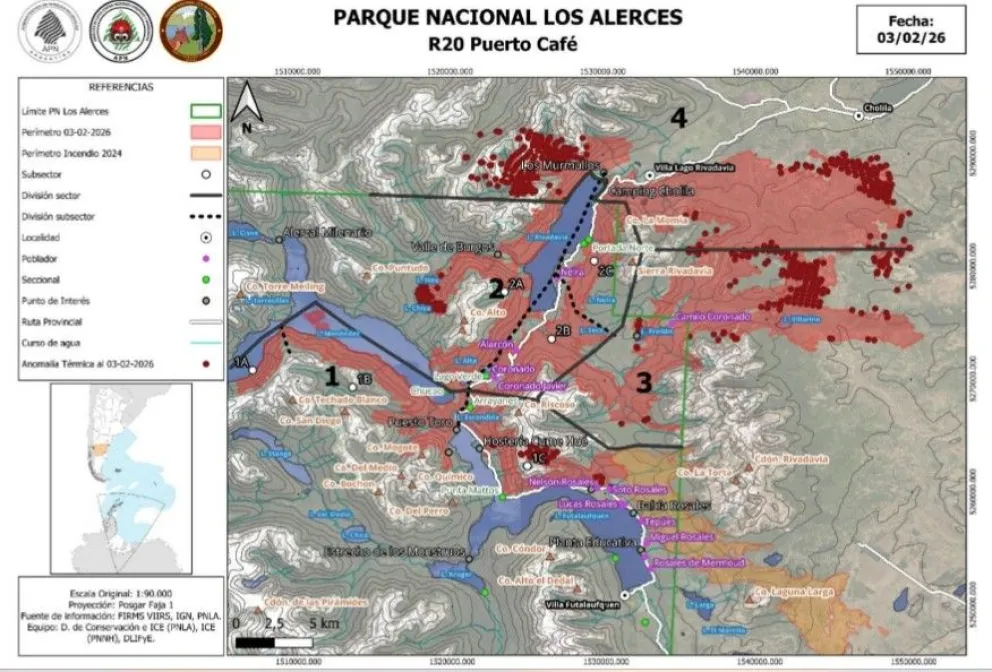 En el Parque Nacional Los Alerces, donde se registran 15 mil hectáreas afectadas, se planificó un combate sostenido frente a los sectores que presentan actividad, mediante un trabajo conjunto entre organismos nacionales y provinciales, y con una dinámica de adaptación permanente a las condiciones meteorológicas con el fin de garantizar la seguridad del personal.