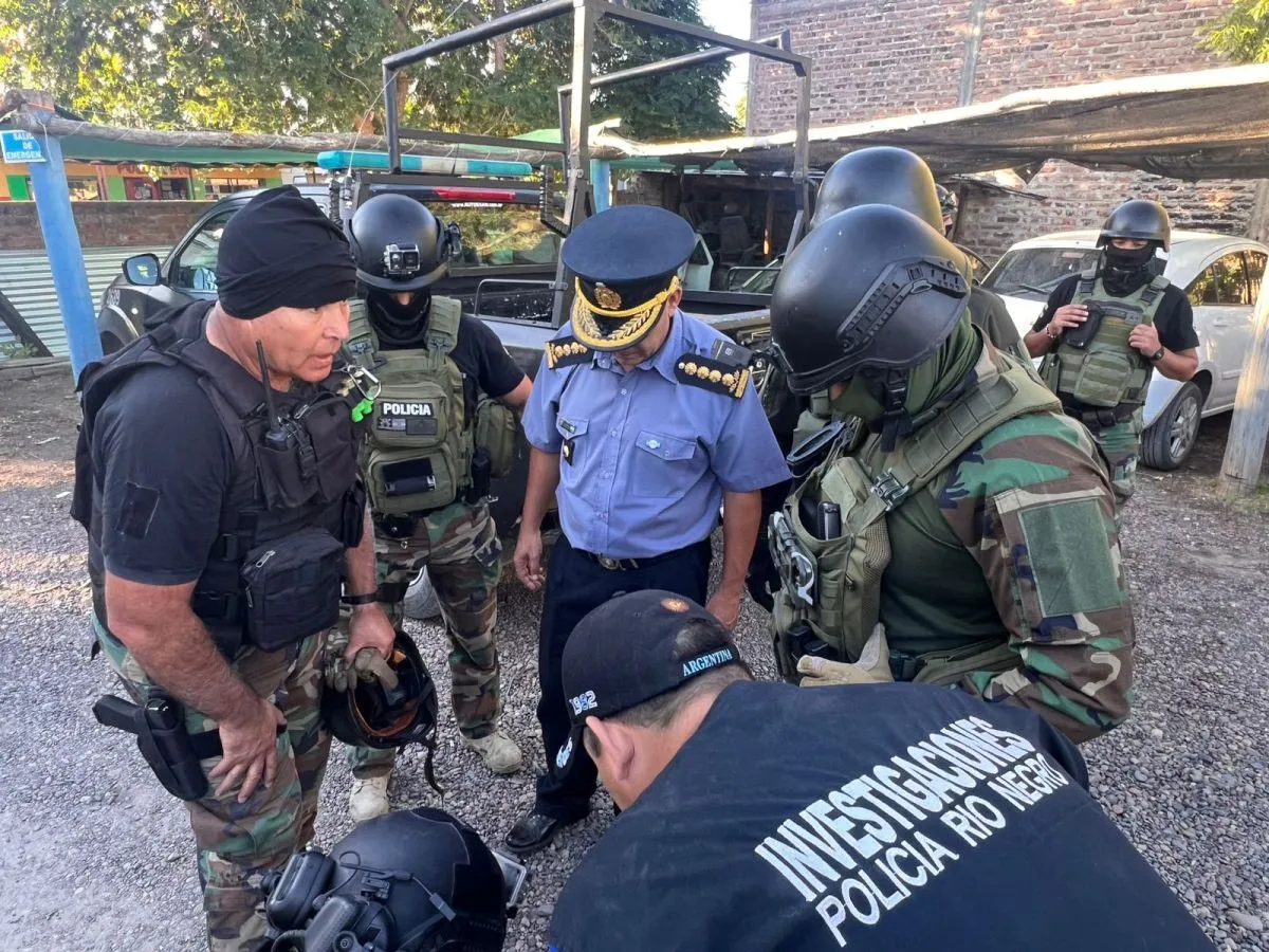 Posteriormente, se llevaron adelante cuatro allanamientos en domicilios de Lamarque y en la zona de chacras. En uno de ellos se secuestraron prendas de vestir y un arma blanca, mientras que en otro se hallaron celulares y una tumbera con munición. En otro domicilio se incautaron más dispositivos móviles, mientras que un cuarto operativo arrojó resultados negativos. Cada uno de estos elementos será sometido a pericias para determinar su posible vinculación con la investigación.